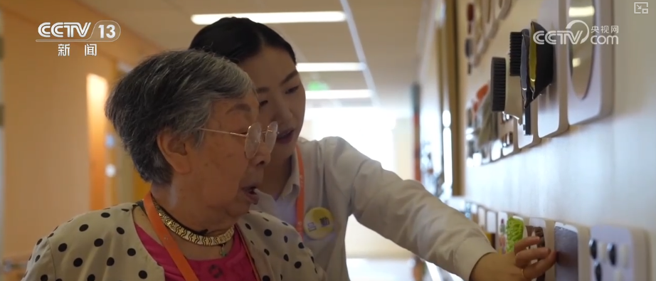 呂勤介紹,這面墻是多感官刺激撫觸類訓練墻。通過一定頻次,規(guī)律去做一些感統(tǒng)訓練的模式,減緩老人感官退化的速度。