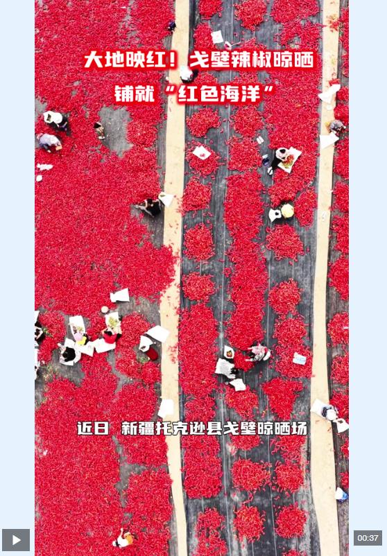 近日,新疆托克遜縣戈壁晾曬場(chǎng)“變身”辣椒晾曬場(chǎng),鋪成了一片壯觀(guān)的“紅色海洋”。