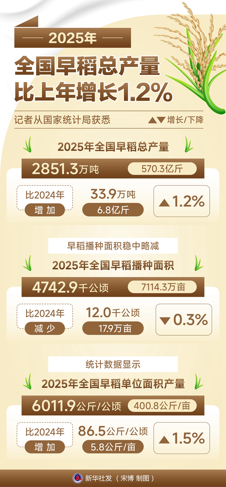 記者從國(guó)家統(tǒng)計(jì)局獲悉,2025年全國(guó)早稻總產(chǎn)量2851.3萬(wàn)噸(570.3億斤),比2024年增加33.9萬(wàn)噸(6.8億斤),增長(zhǎng)1.2%。