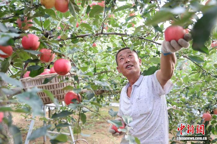 圖為陜西省延安市洛川縣的果農(nóng)正在采摘早熟蘋果?!±钸M 攝