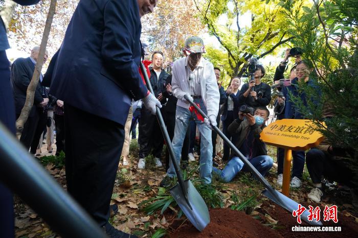 2023年11月3日,美國飛虎隊老兵哈里·莫耶在昆明與中方代表共植友誼樹。中新社記者 劉冉陽 攝