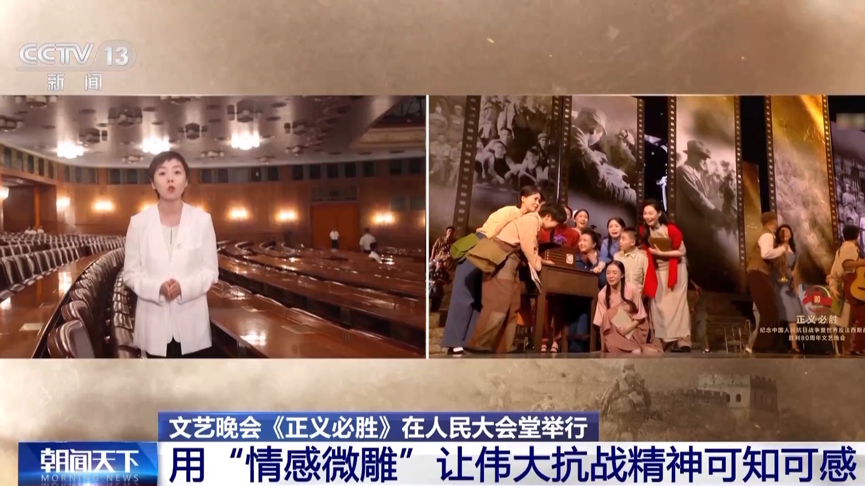 總臺央視記者 曹巖:從八月起我們一直在現(xiàn)場跟蹤記錄抗戰(zhàn)勝利80周年紀(jì)念晚會的排練,我個人覺得這場晚會最大的特征,就是在里面我們看到的不是一個又一個的獨立節(jié)目,而是一整部的情景史詩劇。