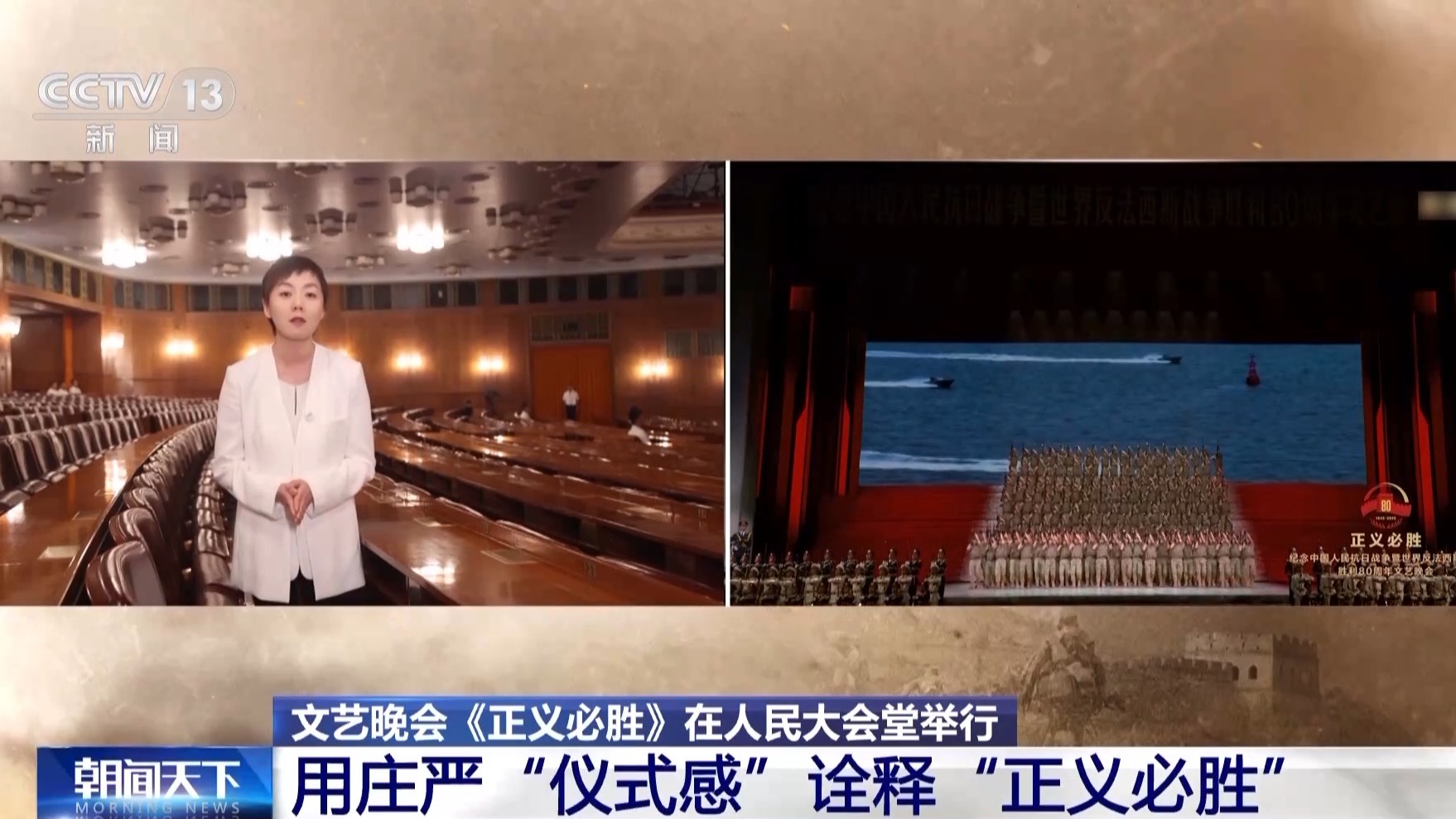 9月3日,從白天廣場閱兵到晚上文藝晚會《正義必勝》,實際上是用12個小時左右的時間,串聯(lián)起一整部抗戰(zhàn)的史詩,是用有機連接、一直貫穿的儀式感,在中國人民抗日戰(zhàn)爭暨世界反法西斯戰(zhàn)爭勝利80周年的歷史節(jié)點上,面向全世界再次鄭重詮釋:正義終將戰(zhàn)勝邪惡,勝利與和平屬于全人類。