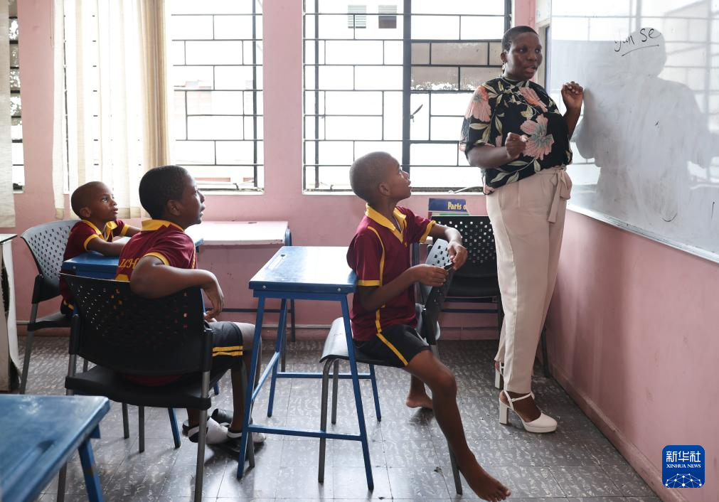 在牙買加首都金斯敦的一間教室里,艾特特殊教育小學(xué)校長(zhǎng)娜塔莎·拉塞爾在黑板上書寫著與顏色相關(guān)的漢字,孩子們端坐在椅子上,跟隨她輕聲朗讀。教室里時(shí)而響起整齊的讀書聲,時(shí)而響起輕快的中文歌曲旋律。