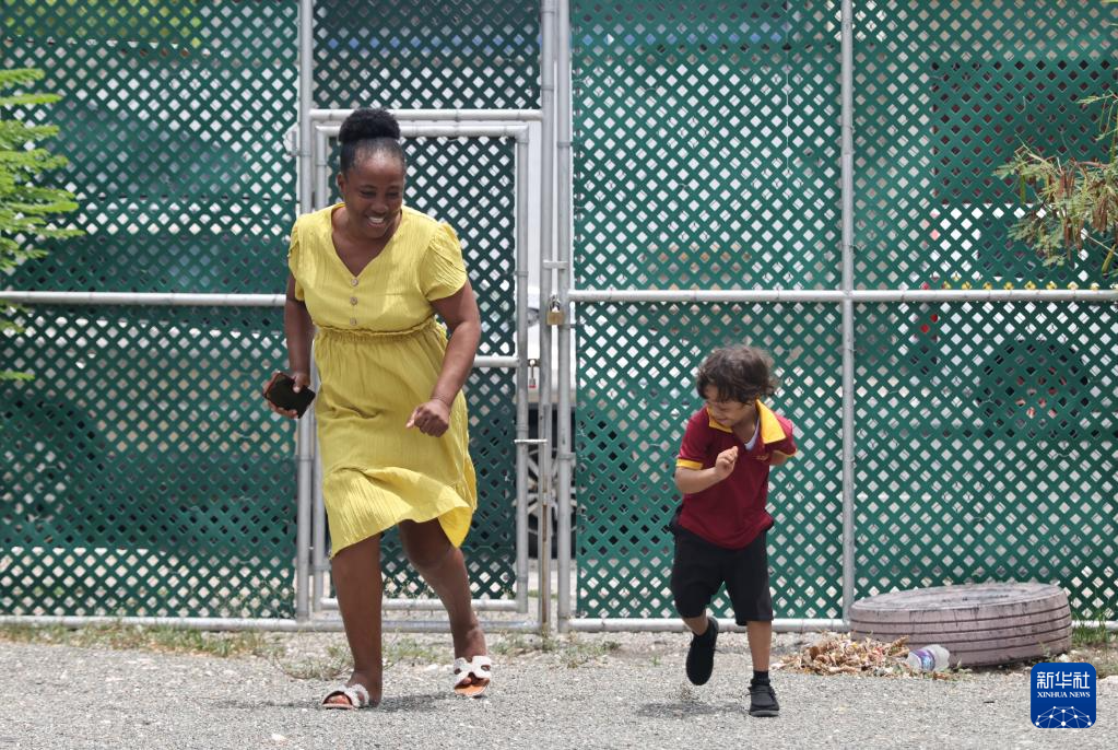 9月4日,在牙買加首都金斯敦艾特特殊教育小學(xué),老師陪伴學(xué)生在操場(chǎng)玩耍。新華社記者 李夢(mèng)馨 攝