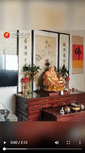 涉案“一貫道”組織某“佛堂”擺放,供奉彌勒佛和濟公等,彌勒佛后上方擺放有“母燈”,指代“無生老母”