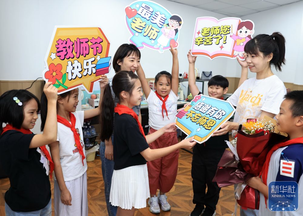 9月9日,在武漢市未來實驗小學(xué)美林校區(qū),學(xué)生為教師送上節(jié)日祝福。新華社發(fā)(趙軍攝)