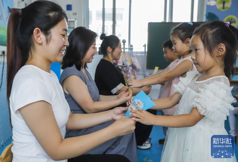 9月9日,河北省遵化市遵化鎮(zhèn)南關(guān)幼兒園的小朋友給老師送賀卡,祝福教師節(jié)。新華社發(fā)(劉滿倉攝)