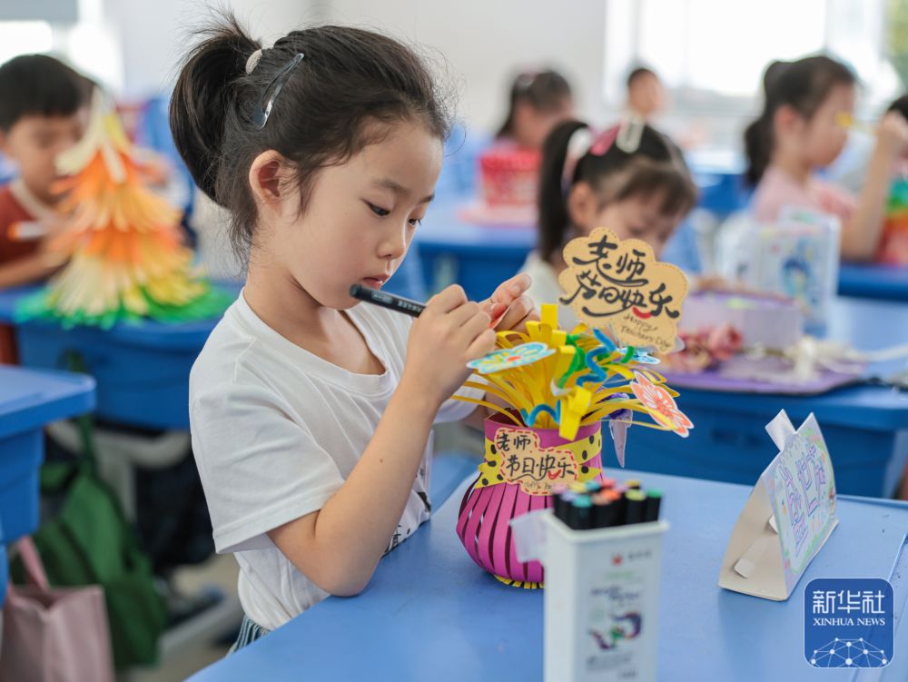 9月9日,山東省臨沂市郯城縣郯城街道官塘幼兒園的孩子將在老師的指導(dǎo)幫助下制作的繪畫送給老師。新華社發(fā)(張春雷攝)