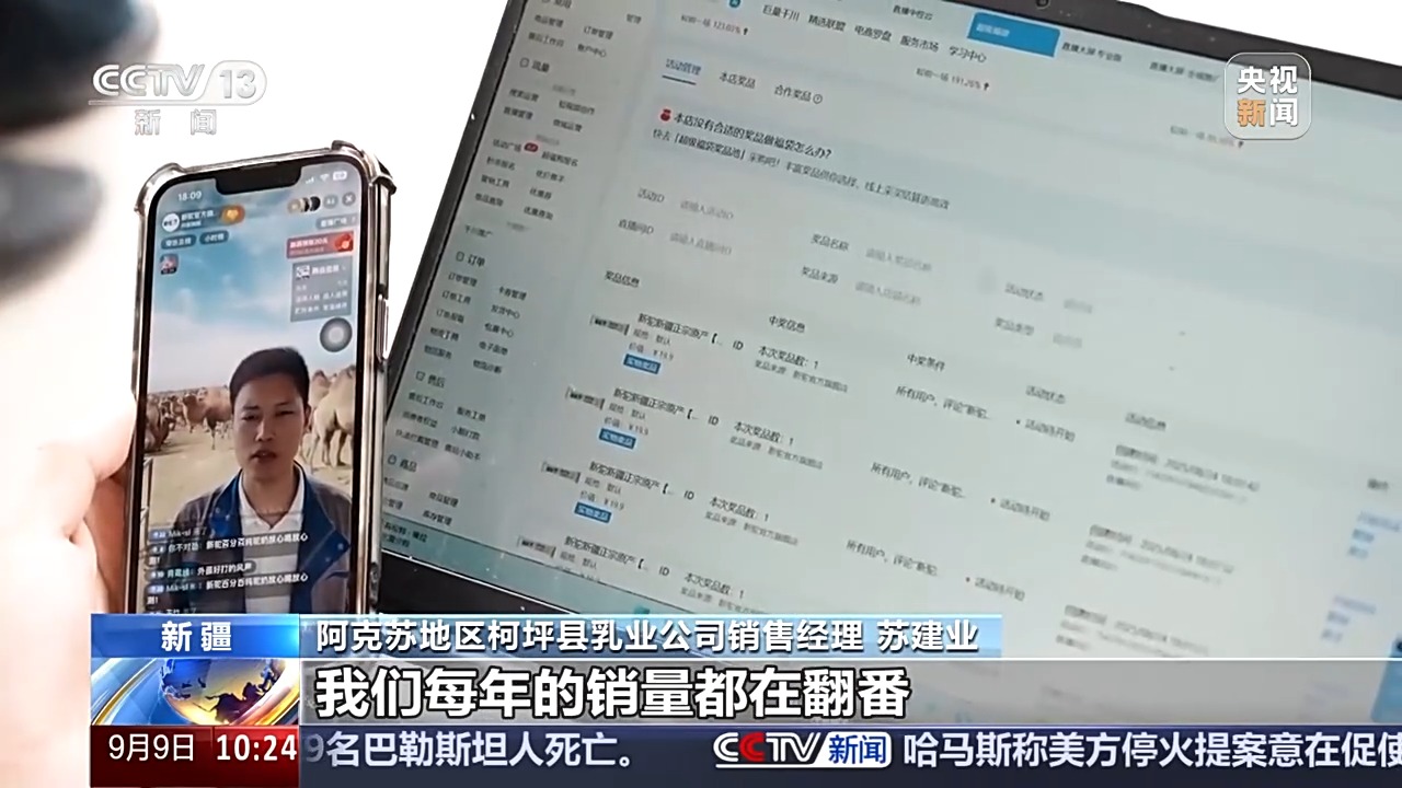 阿克蘇地區(qū)柯坪縣乳業(yè)公司銷售經(jīng)理 蘇建業(yè):我剛才播了大概有1個小時,已經(jīng)賣了有4萬多元了,我們每年的銷量都在翻番。