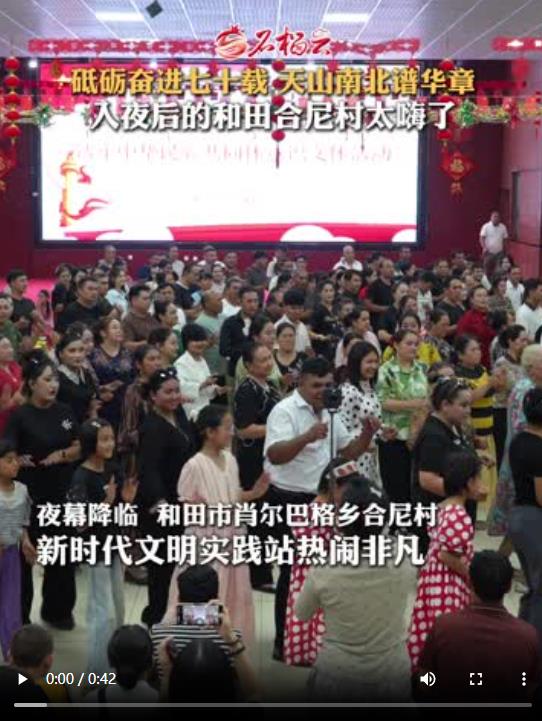夜幕降臨后,和田市肖爾巴格鄉(xiāng)合尼村新時(shí)代文明實(shí)踐站熱鬧非凡。村民們自發(fā)編排舞蹈,有的放聲歌唱、有的盡情起舞,紛紛在舞臺上亮出本領(lǐng)、一展風(fēng)采。精彩的文體活動,為村民送上 “家門口的文化大餐”,既帶來歡聲笑語,也獻(xiàn)上視覺盛宴,更讓大家的生活滿是幸福滋味。
