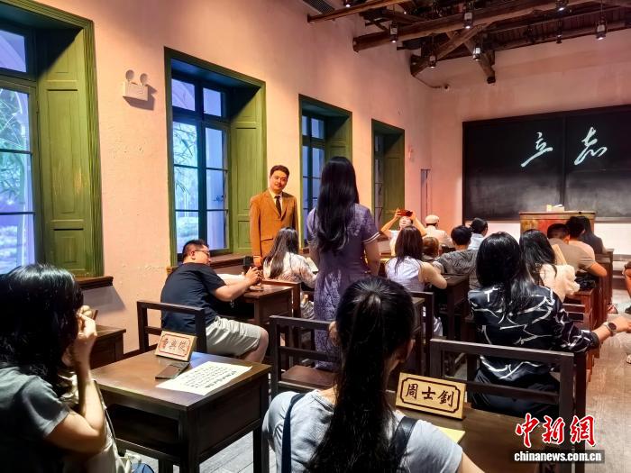 一踏入“校門”,做舊地磚立即吸引了王子悅的視線,“學(xué)生”演員隨即遞上?;?,催促她盡快做好“上課”準備?!拔叶啻卧谏缃黄脚_刷到演出片段,沒想到現(xiàn)場細節(jié)如此到位。”王子悅感慨,強烈的沉浸感讓她從觀眾變成了“劇中人”。