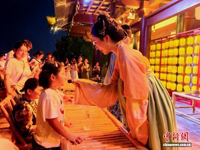 9月5日,長沙杜甫江閣“喜相逢”唐風(fēng)互動夜游活動中,演員正在與觀眾互動。張雪盈 攝