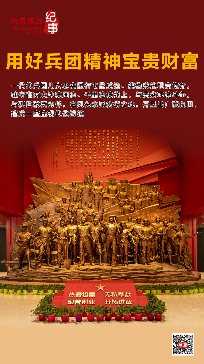 2022年7月,習(xí)近平總書記在新疆考察時(shí)來到新疆生產(chǎn)建設(shè)兵團(tuán)八師石河子市,參觀新疆兵團(tuán)軍墾博物館。會(huì)見兵團(tuán)老中青三代建設(shè)者代表時(shí),他強(qiáng)調(diào),新疆生產(chǎn)建設(shè)兵團(tuán)為推動(dòng)新疆發(fā)展、增進(jìn)民族團(tuán)結(jié)、維護(hù)社會(huì)穩(wěn)定、鞏固國家邊防作出了不可磨滅的貢獻(xiàn)。兵團(tuán)人鑄就的熱愛祖國、無私奉獻(xiàn)、艱苦創(chuàng)業(yè)、開拓進(jìn)取的兵團(tuán)精神,是中國共產(chǎn)黨人精神譜系的重要組成部分,要用好這些寶貴財(cái)富。