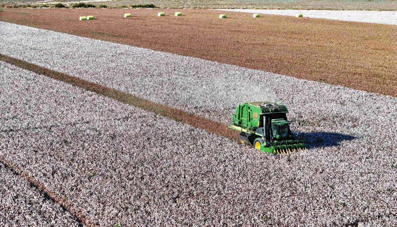 采棉機(jī)在新疆生產(chǎn)建設(shè)兵團(tuán)第六師五家渠市105團(tuán)的棉田采收棉花(2024年9月29日攝)胡虎虎攝/本刊