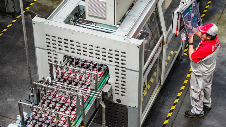 中糧可口可樂(lè)飲料(貴州)有限公司的工作人員在生產(chǎn)線(xiàn)旁進(jìn)行操作(2025年8月24日攝)。