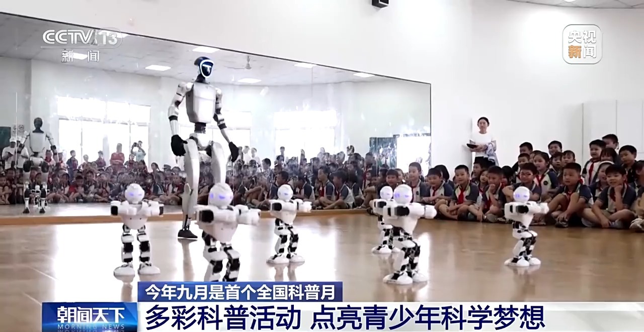 在江西南昌象湖實(shí)驗(yàn)學(xué)校,一場(chǎng)洋溢著濃濃“科技范”的科普體驗(yàn)活動(dòng)正在舉行。在“科技展演”區(qū),6臺(tái)小型舞蹈機(jī)器人靈活地扭動(dòng)身體,整齊劃一的動(dòng)作引來(lái)陣陣掌聲,萌態(tài)十足的仿生機(jī)械狗還可以和學(xué)生們交流互動(dòng)。