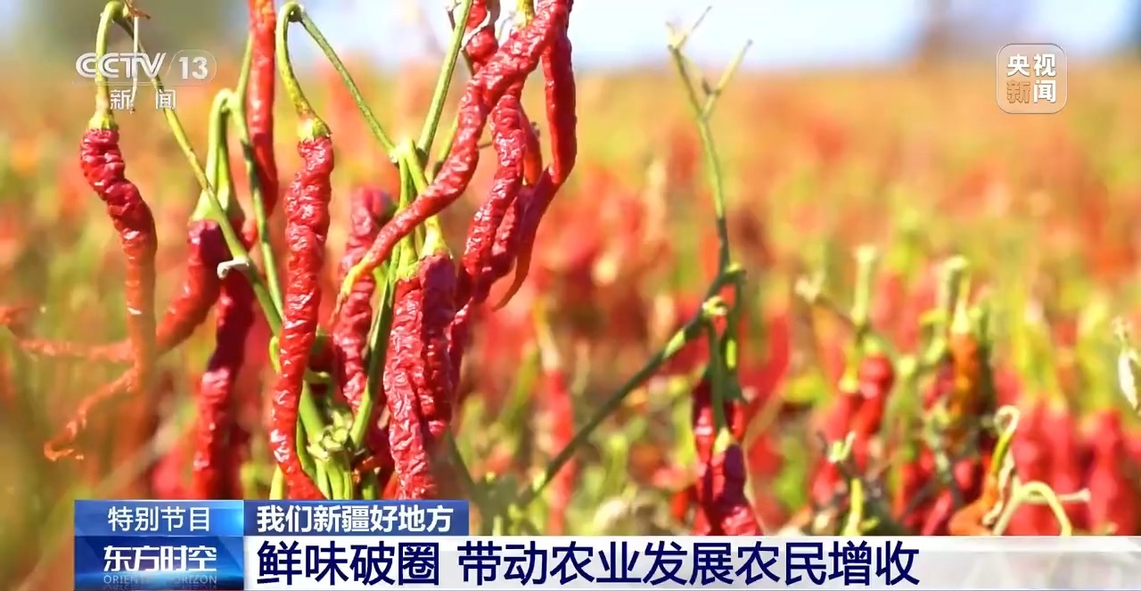 說完了主角,再來說說配菜。這里面的土豆來自博爾通古鄉(xiāng)。最關鍵的辣椒,是當?shù)氐闹饕r(nóng)作物,來自“辣椒之鄉(xiāng)”安集海鎮(zhèn)。過去這里的辣椒只是農(nóng)民零散種植,如今已經(jīng)形成了從育種、種植、加工到銷售的完整產(chǎn)業(yè)鏈。這些辣椒不僅給大盤雞“注入靈魂”,也滿足了全國的餐桌需求,還出口到韓國、日本等地。