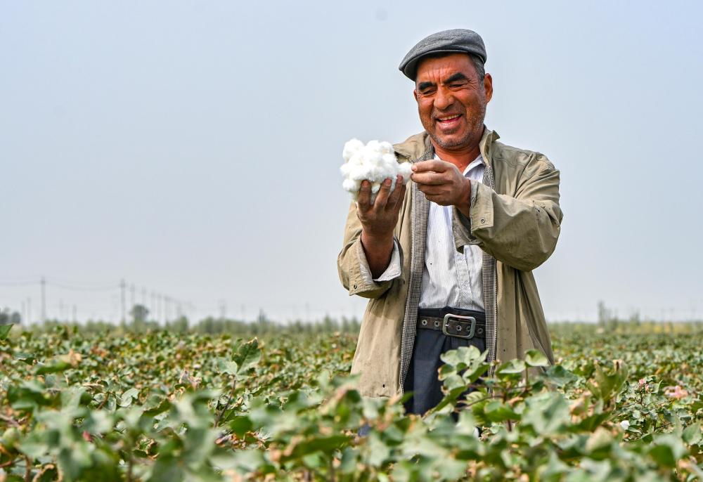 9月19日,尉犁縣達西村二組村民艾合買提·吐爾遜在棉田里查看棉花。