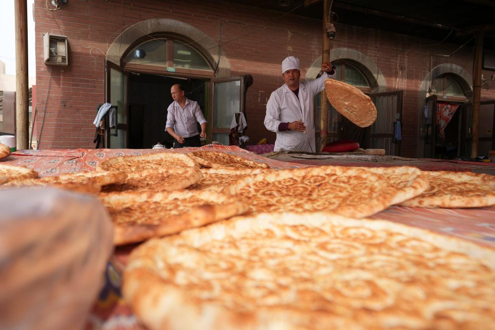 9月19日,達西村村民肉則·賽麥提(右)在文旅商業(yè)街上制作馕。近年來,達西村打造文旅商業(yè)街,吸引村民入駐,為村民增收。