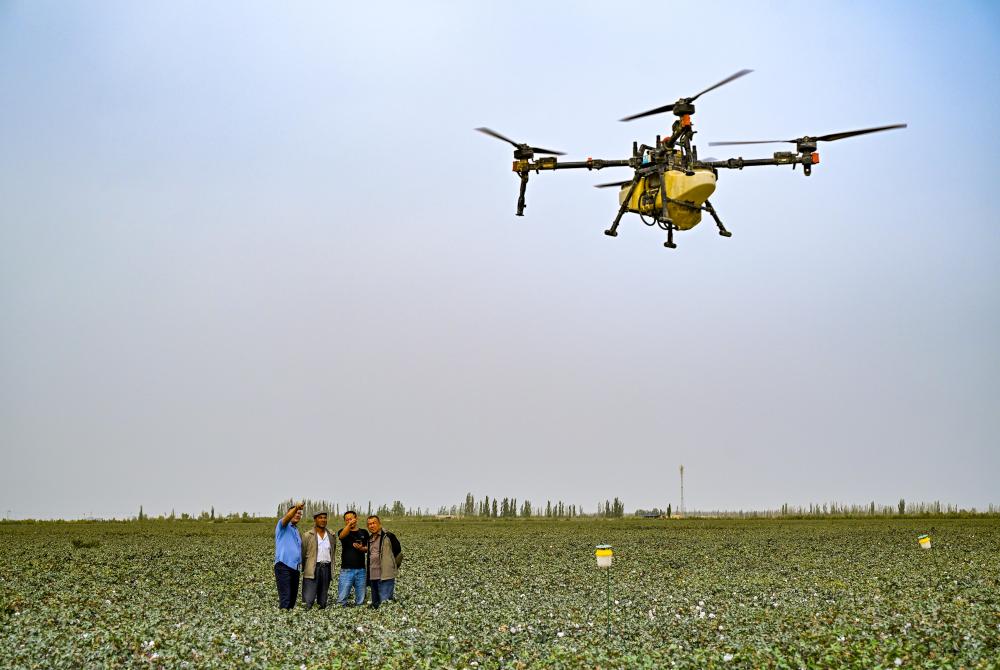9月19日,極飛超級棉田負責(zé)人艾海鵬(右二)在尉犁縣的示范棉田里為達西村村民進行智能無人機灑藥培訓(xùn)。無人化智慧農(nóng)場應(yīng)用農(nóng)業(yè)無人機、農(nóng)業(yè)無人車、遙感無人機、農(nóng)機自駕儀等系列物聯(lián)設(shè)備實施“水肥一體化”管理,農(nóng)民用一部手機即可操作智能設(shè)備完成多項田間管理工作。