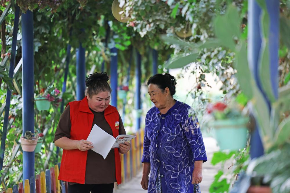 9月18日,達西村村干部古力帕爾力·克衣木(右)入戶詢問村民生活情況。
