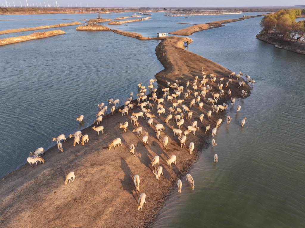 這是2024年10月28日在江蘇省大豐麋鹿國(guó)家級(jí)自然保護(hù)區(qū)拍攝的麋鹿(無(wú)人機(jī)照片)。新華社記者 鄧華 攝
