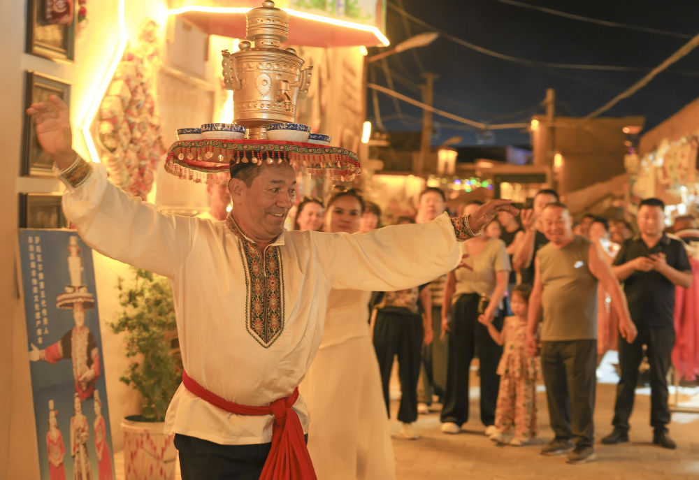 夜幕降臨,煙火氣息在庫車?yán)铣菑浡V場上傳來歡快的樂曲聲,舞者頭頂銅盤銅壺,腳步輕快,將迎賓之禮——薩瑪瓦爾舞展現(xiàn)在游客面前,掌聲與歡笑聲此起彼伏。