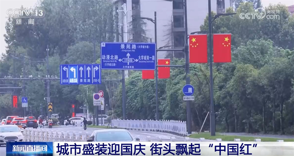 迎風(fēng)飄揚(yáng)的五星紅旗與蔥郁的街道綠樹交織,構(gòu)成了一道亮麗的風(fēng)景線。一抹抹躍動(dòng)的“中國紅”扮靚了城市街景,也點(diǎn)燃了人們內(nèi)心深處的愛國熱情。