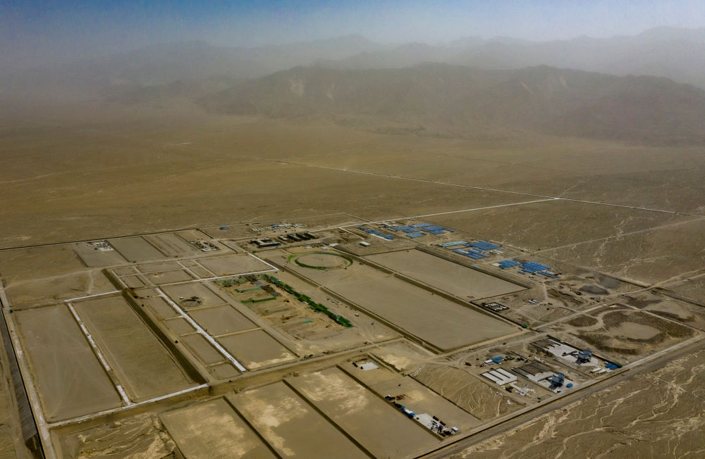 9月22日在新疆巴音郭楞蒙古自治州若羌縣拍攝的三峽集團“疆電外送”第四通道電源項目施工現(xiàn)場(無人機照片)。