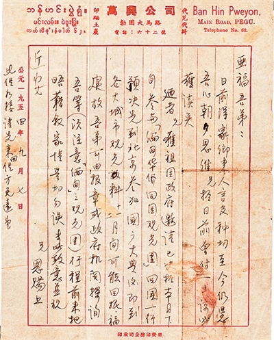 廼者兄獲祖國(guó)政府邀請(qǐng),已決于本月下旬參與“緬甸華僑回國(guó)觀光團(tuán)”回國(guó)一行,預(yù)決先到北京參加國(guó)慶大典,后即到各大城市觀光,料十一二月間可能回抵福建,故吾弟可由報(bào)章或政府機(jī)關(guān)探詢吾等(須注意“緬甸”之觀光團(tuán))行程,前來(lái)把晤,藉敘家情,是切勿誤。