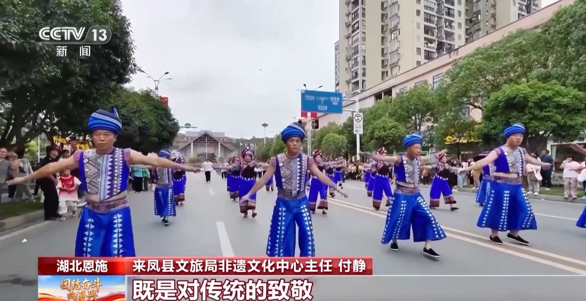 來(lái)鳳縣文旅局非遺文化中心主任 付靜:國(guó)慶是舉國(guó)歡慶的日子,用擺手舞巡游的形式慶祝,既是對(duì)傳統(tǒng)的致敬,也是對(duì)新時(shí)代的禮贊。