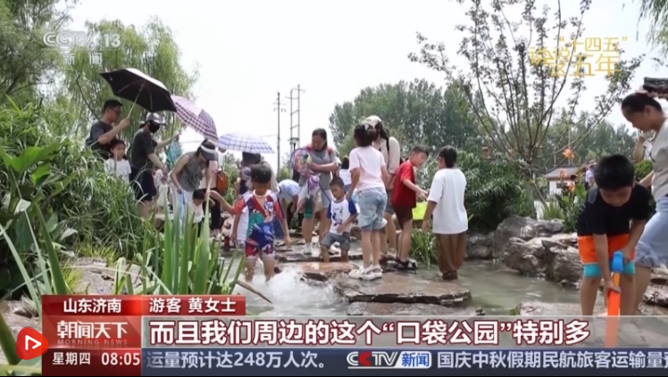游客黃女士說,山更青了、水更美了,祖國處處的山水都很美。周邊的口袋公園特別多,方便他們鍛煉身體對(duì)老年人很有幫助。