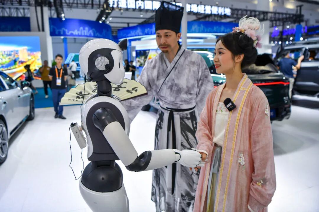 2024年4月15日,海南海口,第四屆中國(guó)國(guó)際消費(fèi)品博覽會(huì)上,身著漢服的參觀者與“柔美人形智能服務(wù)機(jī)器人”互動(dòng)。中新社記者 駱云飛 攝