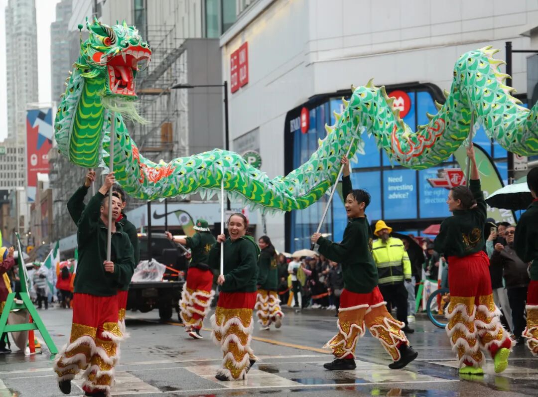 當(dāng)?shù)貢r(shí)間2025年3月16日,加拿大多倫多,在慶祝愛爾蘭民族傳統(tǒng)節(jié)日圣帕特里克節(jié)(St. Patrick’s Day)的大游行中,一支中式舞龍隊(duì)舞動(dòng)綠色長(zhǎng)龍。中新社記者 余瑞冬 攝