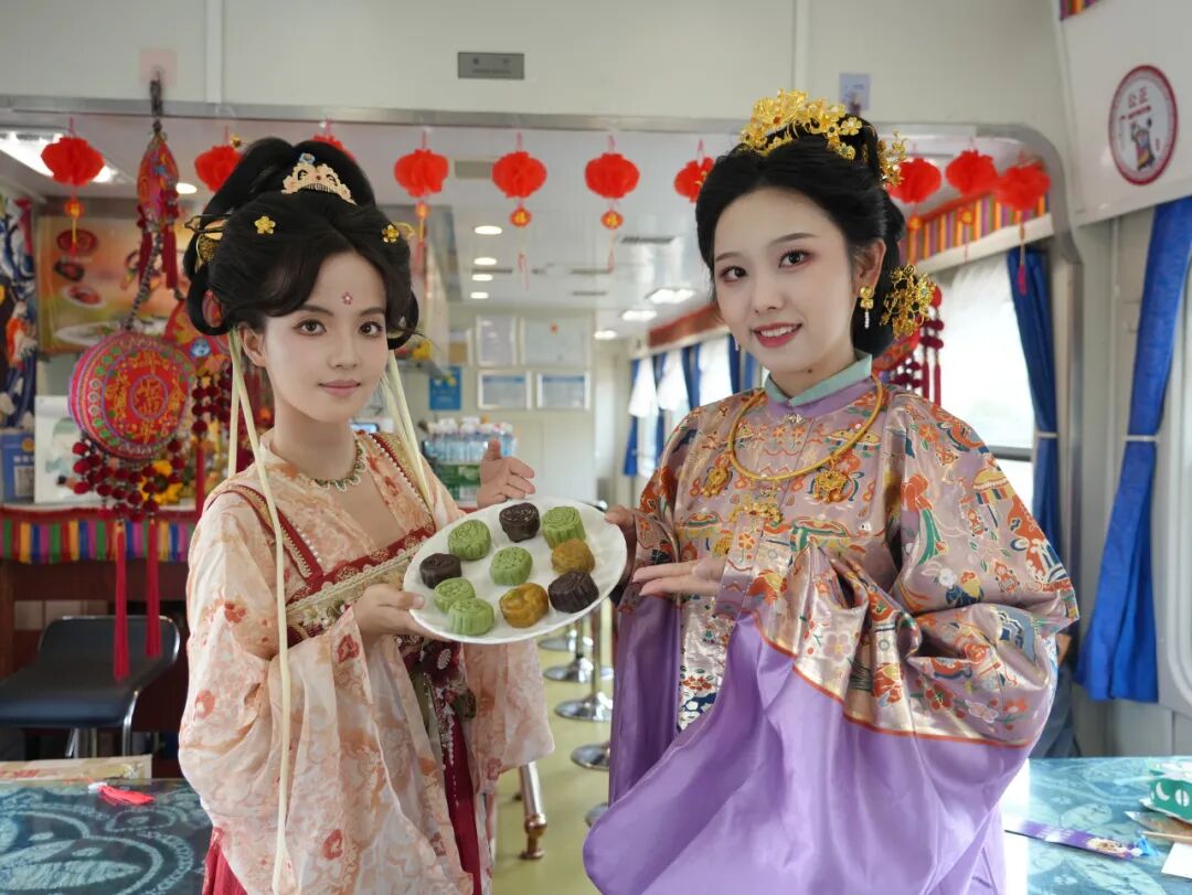 “旅客朋友們,歡迎乘坐本趟列車,中秋佳節(jié)將至,我們在2號餐車準備了特色活動,誠邀大家共慶佳節(jié)!”列車長李文雯的聲音通過廣播傳遍車廂。隨即《納西三部曲》旋律響起——身著絢麗民族服飾的列車員們,拉著周圍旅客一同跳起納西族舞蹈,歡快的節(jié)奏瞬間點燃車廂氣氛。