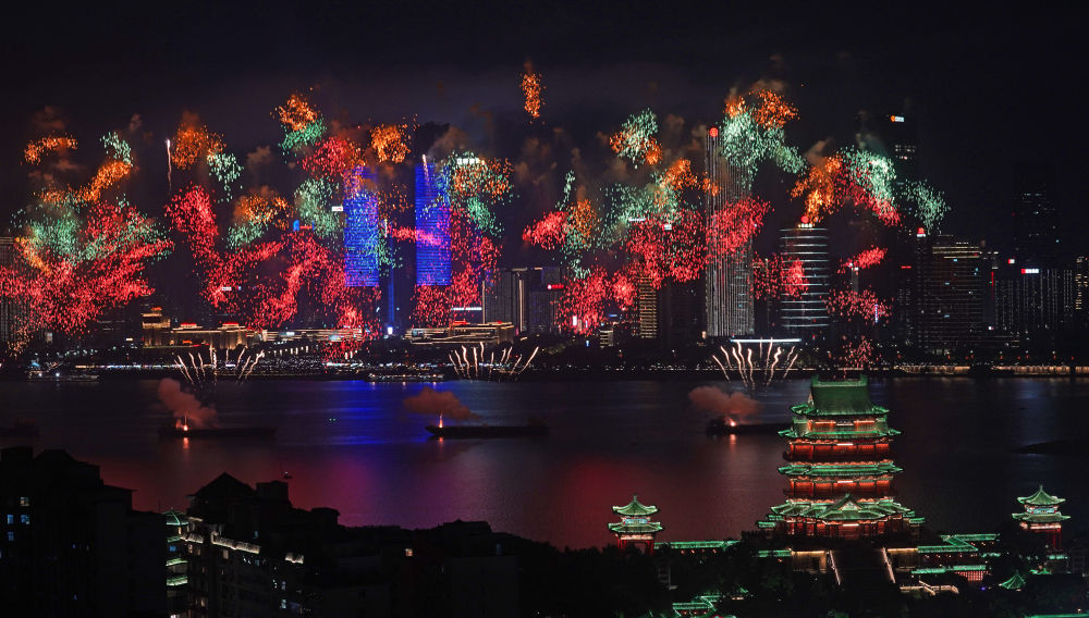 10月1日,2025年南昌市國慶煙花晚會(huì)在江西省南昌市贛江老官洲水域舉辦。新華社記者 萬象 攝