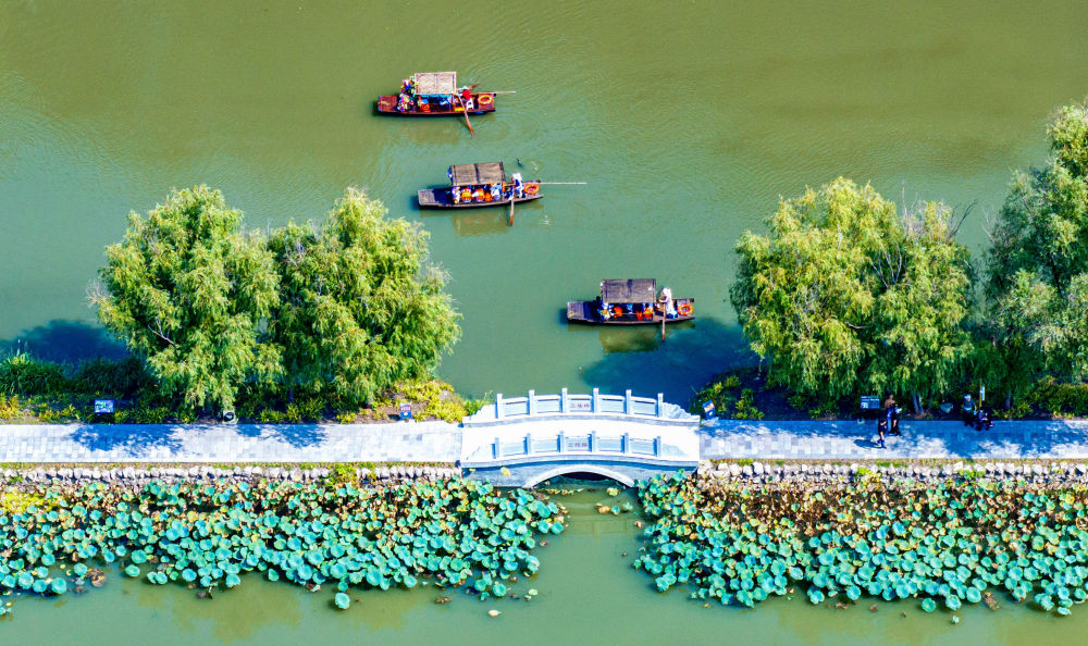 10月7日,游客在江蘇興化里下河國家濕地公園乘船游玩(無人機(jī)照片)。新華社發(fā)(周社根攝)