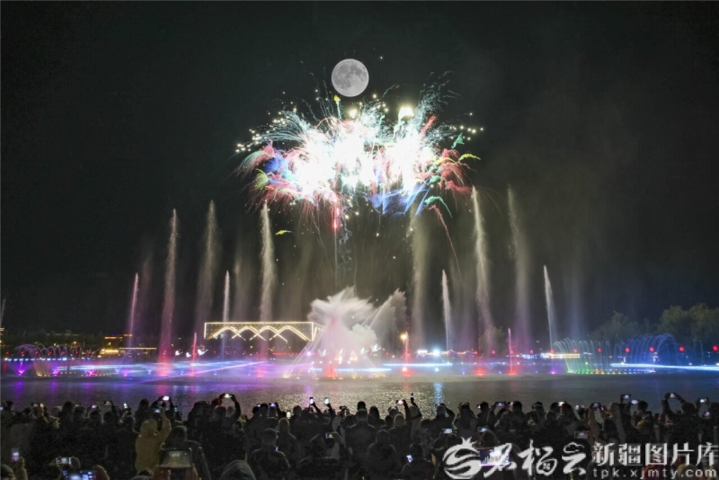 10月6日晚,新源縣天鵝湖景區(qū)、大型激光水舞煙花秀與圓月同框。張文庭 攝