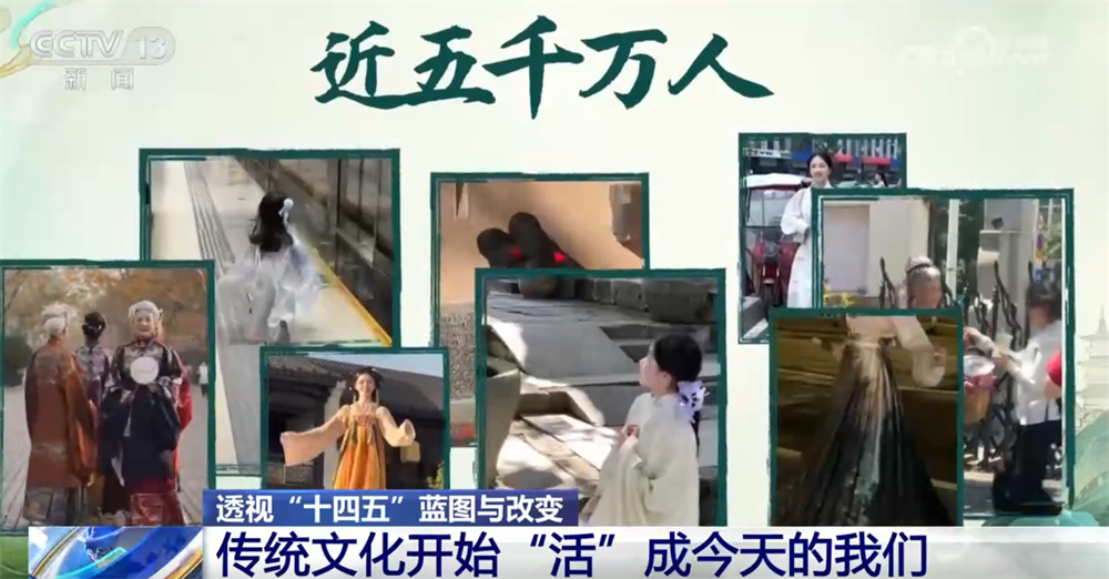 央視網(wǎng)消息:過去,我們在課本里背古詩、學(xué)歷史;今天,我們身著漢服走上街頭,在旅行打卡、短視頻創(chuàng)作中重新感受傳統(tǒng)。五千年的文化正在從書頁走向街頭,從展廳走進生活,成為我們?nèi)粘5囊徊糠帧!笆奈濉钡奈迥?,讓文化真正“活”在了當下,也“活”進了我們的生活。