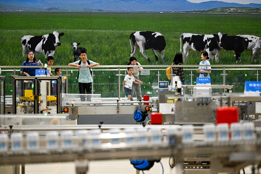 2025年7月28日,游客在呼和浩特市伊利現(xiàn)代智慧健康谷液態(tài)奶全球智造標桿基地參觀。新華社記者 李志鵬 攝