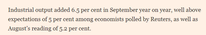 英國(guó)《金融時(shí)報(bào)》的文章分析說(shuō),9月規(guī)模以上工業(yè)增加值同比增長(zhǎng)6.5%,顯著高于路透社調(diào)查經(jīng)濟(jì)學(xué)家預(yù)期的5%及8月的5.2%。荷蘭國(guó)際集團(tuán)(ING)經(jīng)濟(jì)學(xué)家分析稱,超預(yù)期表現(xiàn)主要源于外需拉動(dòng)。文章說(shuō),上周,海關(guān)數(shù)據(jù)顯示,中國(guó)出口保持韌性,9月同比增長(zhǎng)8.3%,對(duì)東南亞等地區(qū)出口持續(xù)增長(zhǎng)。