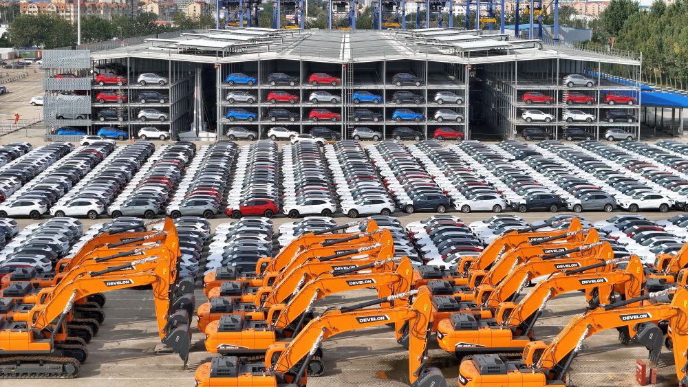 10月20日,國(guó)產(chǎn)汽車(chē)和工程機(jī)械在山東港口煙臺(tái)港集結(jié)等待裝船出口(無(wú)人機(jī)照片)。新華社發(fā)(唐克 攝)