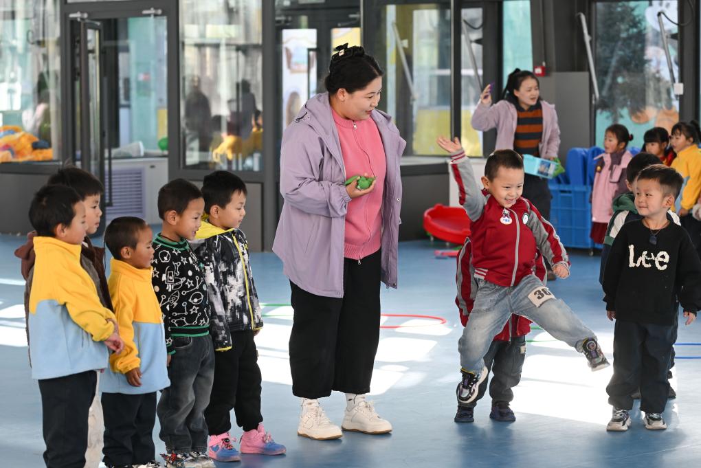2024年11月14日,在青海天峻縣民族幼兒園,小朋友們在老師帶領下上體育課。新華社記者 張龍 攝