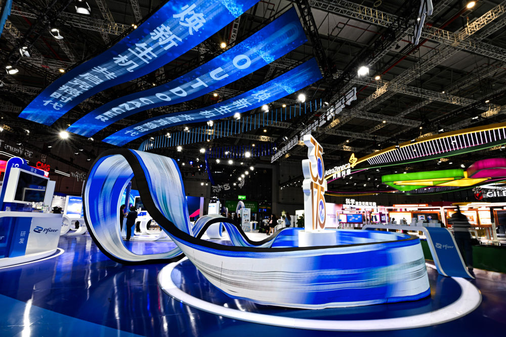 這是2024年11月8日在第七屆進博會醫(yī)療器械及醫(yī)藥保健展區(qū)拍攝的輝瑞展臺。新華社記者 辛悅衛(wèi) 攝