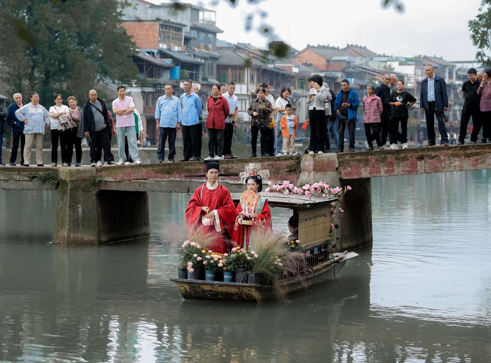 國慶節(jié)期間,成都邛崍市夾關(guān)古鎮(zhèn)舉行的水上婚禮儀式。(受訪單位供圖)