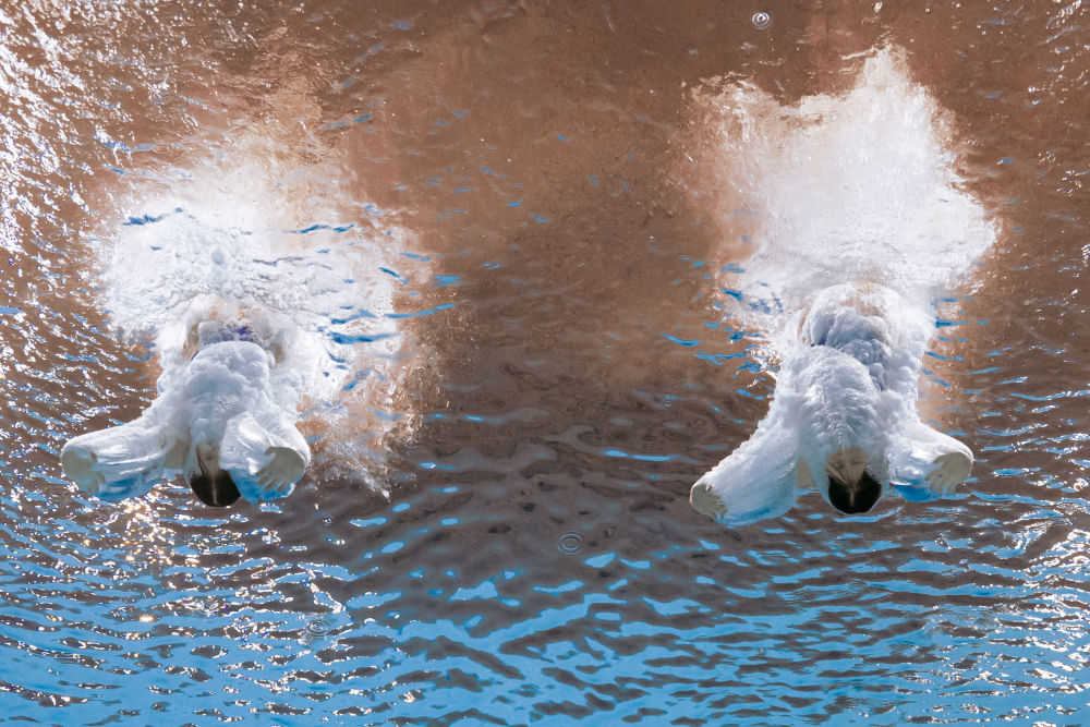 11月2日,廣東隊(duì)組合全紅嬋/王偉瑩在跳水女子團(tuán)體賽雙人10米跳臺項(xiàng)目比賽中。新華社記者 夏一方 攝