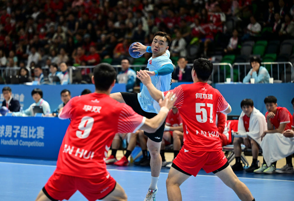 11月8日,在香港進(jìn)行的第十五屆全國運(yùn)動會男子手球半決賽中,香港隊(duì)球員連潤滔(中)在比賽中射門。新華社記者 于洋 攝