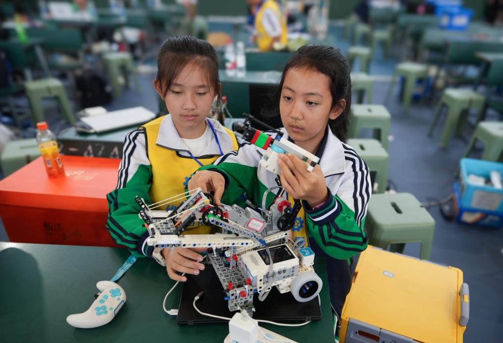 5月31日,兩名參賽選手在全國青少年科技教育成果展示大賽云南省區(qū)域賽上調(diào)試比賽用的機器人。新華社記者 陳欣波 攝