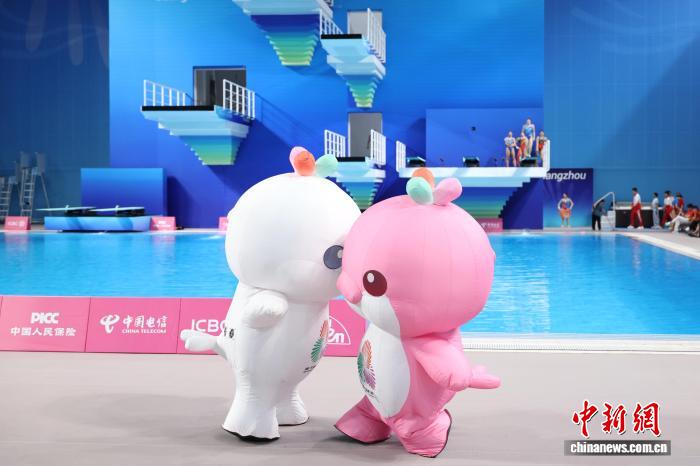 11月11日,第十五屆全國(guó)運(yùn)動(dòng)會(huì)跳水項(xiàng)目女子3米跳板決賽在廣東省奧體中心游泳跳水館舉行。圖為比賽前,十五運(yùn)會(huì)吉祥物帶來(lái)暖場(chǎng)表演。 中新社記者 陳楚紅 攝